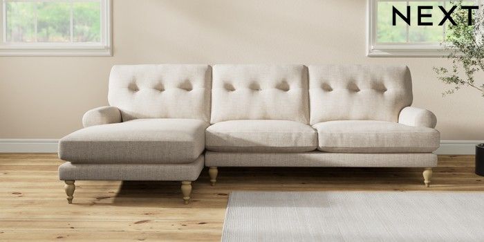 7.2.10 Erin Buttoned Back Deep Relaxed Sit Medium Sofa Chaise - Left Hand Chunky Weave Mid Natural High Classic Turned - Light | Made Click here to use our website with more accessibility support, for example screen readers