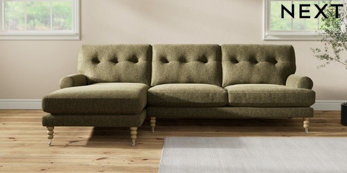 7.2.10 Erin Buttoned Back Deep Relaxed Sit Medium Sofa Chaise - Left Hand Cotswold Chenille Dark Green High Classic Turned Chrome Castor - Light | Made Click here to use our website with more accessibility support, for example screen readers