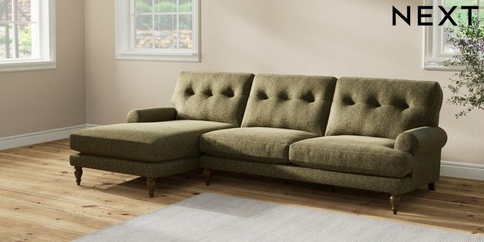 7.2.10 Erin Buttoned Back Deep Relaxed Sit Medium Sofa Chaise - Left Hand Cotswold Chenille Dark Green High Classic Turned - Mid | Made Click here to use our website with more accessibility support, for example screen readers