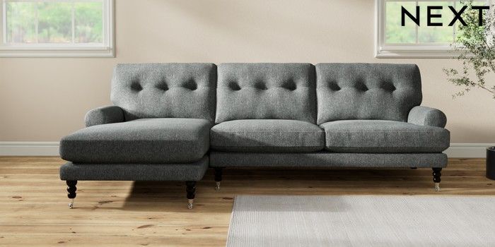 7.2.10 Erin Buttoned Back Deep Relaxed Sit Medium Sofa Chaise - Left Hand Cotswold Chenille Dark Grey High Classic Turned Chrome Castor - Dark | Made Click here to use our website with more accessibility support, for example screen readers