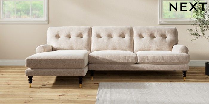 7.2.10 Erin Buttoned Back Deep Relaxed Sit Medium Sofa Chaise - Left Hand Cotswold Chenille Light Natural High Classic Turned Brass Castor - Dark | Made Click here to use our website with more accessibility support, for example screen readers