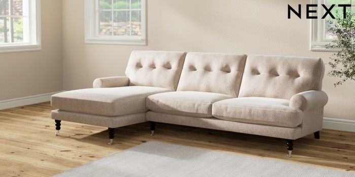 7.2.10 Erin Buttoned Back Deep Relaxed Sit Medium Sofa Chaise - Left Hand Cotswold Chenille Light Natural High Classic Turned Chrome Castor - Dark | Made Click here to use our website with more accessibility support, for example screen readers