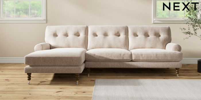 7.2.10 Erin Buttoned Back Deep Relaxed Sit Medium Sofa Chaise - Left Hand Cotswold Chenille Light Natural High Classic Turned Chrome Castor - Mid | Made Click here to use our website with more accessibility support, for example screen readers