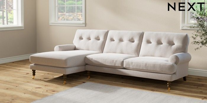 7.2.10 Erin Buttoned Back Deep Relaxed Sit Medium Sofa Chaise - Left Hand Cotswold Chenille Oyster High Classic Turned Brass Castor - Mid | Made Click here to use our website with more accessibility support, for example screen readers
