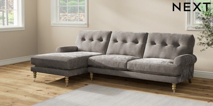 7.2.10 Erin Buttoned Back Deep Relaxed Sit Medium Sofa Chaise - Left Hand Distressed Velour French Grey High Classic Turned Chrome Castor - Light | Made Click here to use our website with more accessibility support, for example screen readers