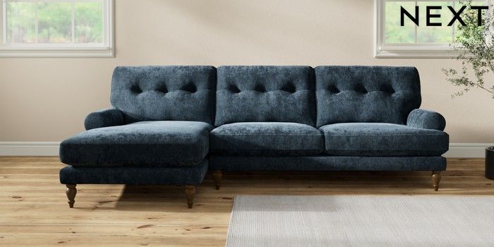 7.2.10 Erin Buttoned Back Deep Relaxed Sit Medium Sofa Chaise - Left Hand Distressed Velour Midnight Blue High Classic Turned - Mid | Made Click here to use our website with more accessibility support, for example screen readers