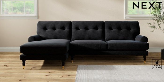 7.2.10 Erin Buttoned Back Deep Relaxed Sit Medium Sofa Chaise - Left Hand Fine Chenille Easy Clean Black High Classic Turned Brass Castor - Dark | Made Click here to use our website with more accessibility support, for example screen readers