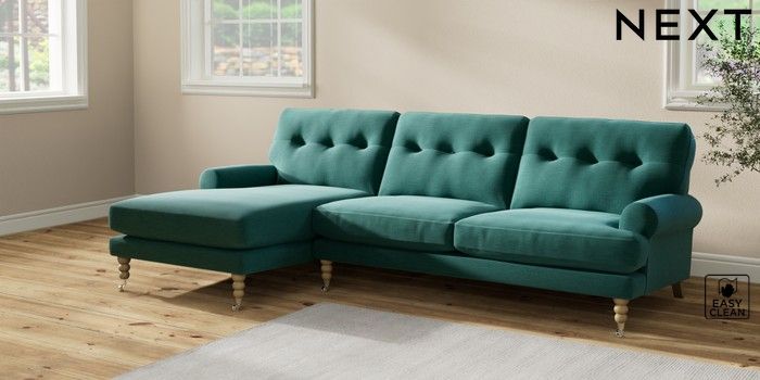 7.2.10 Erin Buttoned Back Deep Relaxed Sit Medium Sofa Chaise - Left Hand Fine Chenille Easy Clean Dark Juniper Green High Classic Turned Chrome Castor - Light | Made Click here to use our website with more accessibility support, for example screen readers