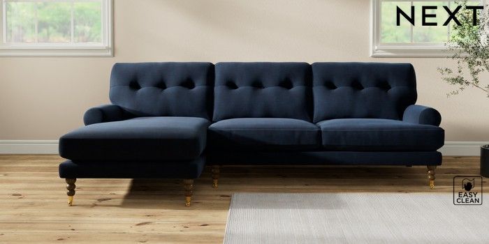 7.2.10 Erin Buttoned Back Deep Relaxed Sit Medium Sofa Chaise - Left Hand Fine Chenille Easy Clean Dark Navy Blue High Classic Turned Brass Castor - Mid | Made Click here to use our website with more accessibility support, for example screen readers