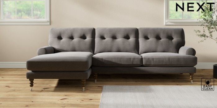 7.2.10 Erin Buttoned Back Deep Relaxed Sit Medium Sofa Chaise - Left Hand Fine Chenille Easy Clean Dark Smoke Grey High Classic Turned Chrome Castor - Mid | Made Click here to use our website with more accessibility support, for example screen readers