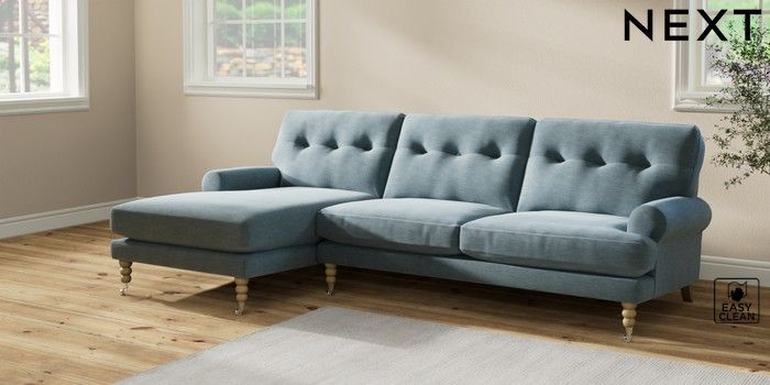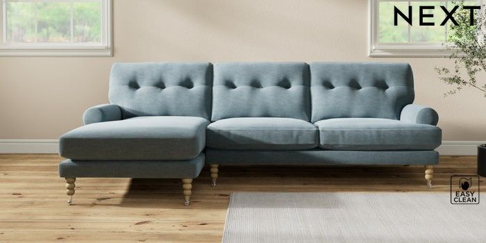 7.2.10 Erin Buttoned Back Deep Relaxed Sit Medium Sofa Chaise - Left Hand Fine Chenille Easy Clean Mid Blue High Classic Turned Chrome Castor - Light | Made Click here to use our website with more accessibility support, for example screen readers
