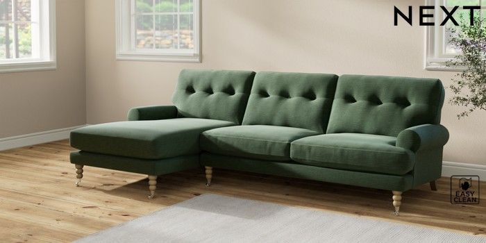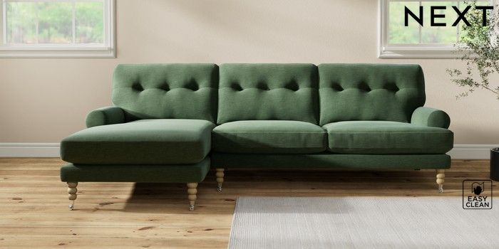 7.2.10 Erin Buttoned Back Deep Relaxed Sit Medium Sofa Chaise - Left Hand Fine Chenille Easy Clean Mid Khaki Green High Classic Turned Chrome Castor - Light | Made Click here to use our website with more accessibility support, for example screen readers
