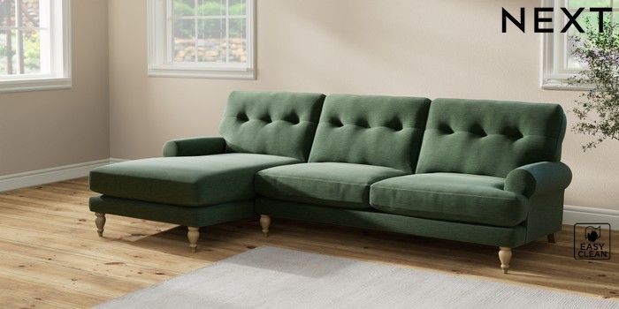 7.2.10 Erin Buttoned Back Deep Relaxed Sit Medium Sofa Chaise - Left Hand Fine Chenille Easy Clean Mid Khaki Green High Classic Turned - Light | Made Click here to use our website with more accessibility support, for example screen readers