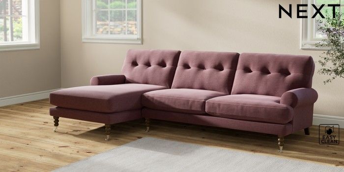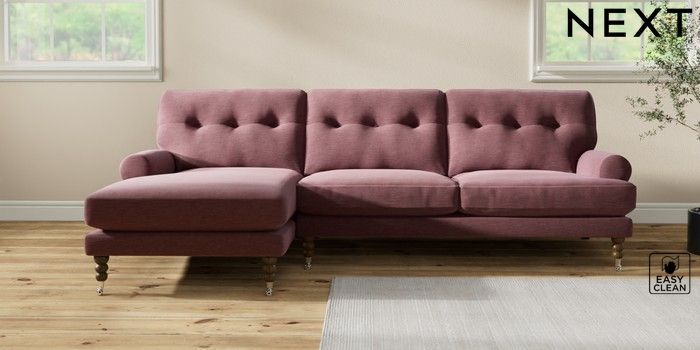 7.2.10 Erin Buttoned Back Deep Relaxed Sit Medium Sofa Chaise - Left Hand Fine Chenille Easy Clean Mid Mulberry Purple High Classic Turned Chrome Castor - Mid | Made Click here to use our website with more accessibility support, for example screen readers