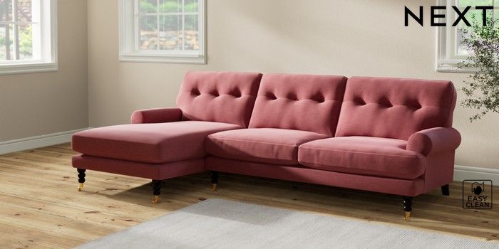 7.2.10 Erin Buttoned Back Deep Relaxed Sit Medium Sofa Chaise - Left Hand Fine Chenille Easy Clean Mid Pink High Classic Turned Brass Castor - Dark | Made Click here to use our website with more accessibility support, for example screen readers