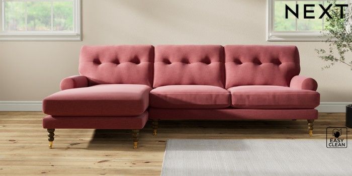 7.2.10 Erin Buttoned Back Deep Relaxed Sit Medium Sofa Chaise - Left Hand Fine Chenille Easy Clean Mid Pink High Classic Turned Brass Castor - Mid | Made Click here to use our website with more accessibility support, for example screen readers
