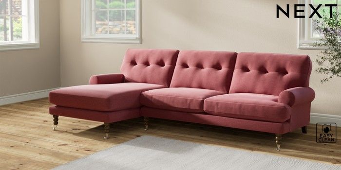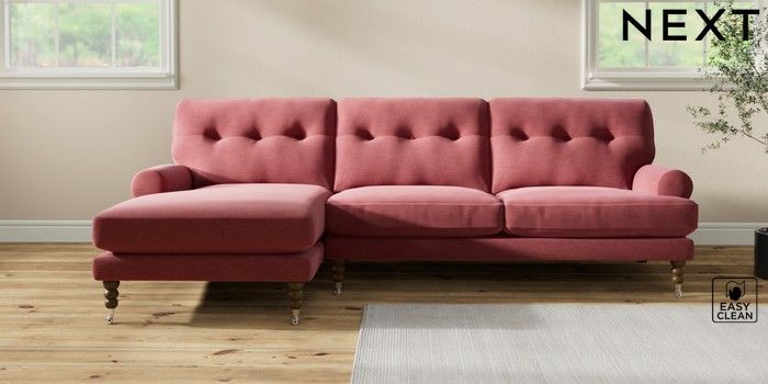 7.2.10 Erin Buttoned Back Deep Relaxed Sit Medium Sofa Chaise - Left Hand Fine Chenille Easy Clean Mid Pink High Classic Turned Chrome Castor - Mid | Made Click here to use our website with more accessibility support, for example screen readers