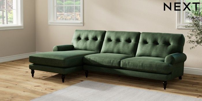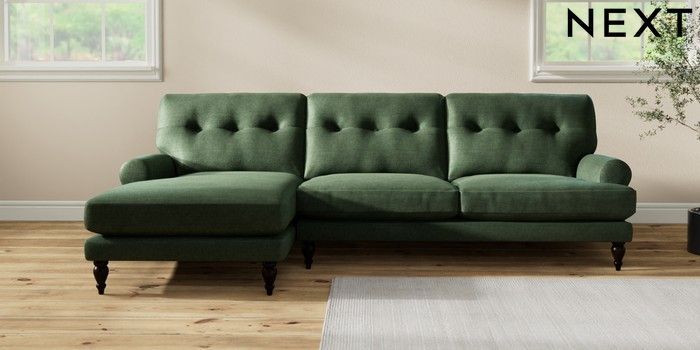 7.2.10 Erin Buttoned Back Deep Relaxed Sit Medium Sofa Chaise - Left Hand Luxe Chenille Dark Green High Classic Turned - Dark | Made Click here to use our website with more accessibility support, for example screen readers