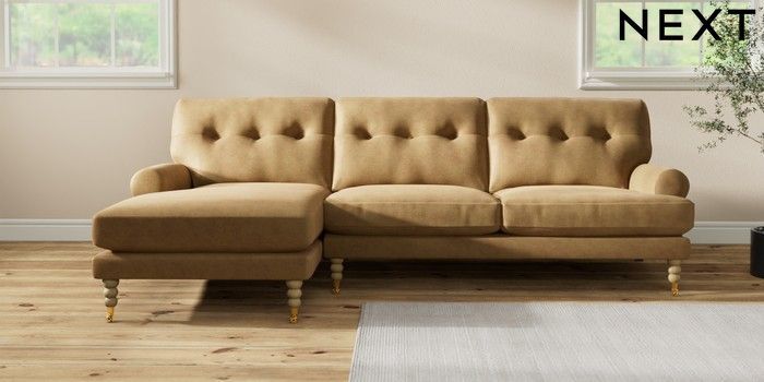 7.2.10 Erin Buttoned Back Deep Relaxed Sit Medium Sofa Chaise - Left Hand Luxe Chenille Honey Yellow High Classic Turned Brass Castor - Light | Made Click here to use our website with more accessibility support, for example screen readers