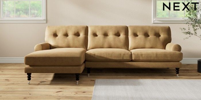 7.2.10 Erin Buttoned Back Deep Relaxed Sit Medium Sofa Chaise - Left Hand Luxe Chenille Honey Yellow High Classic Turned Chrome Castor - Dark | Made Click here to use our website with more accessibility support, for example screen readers