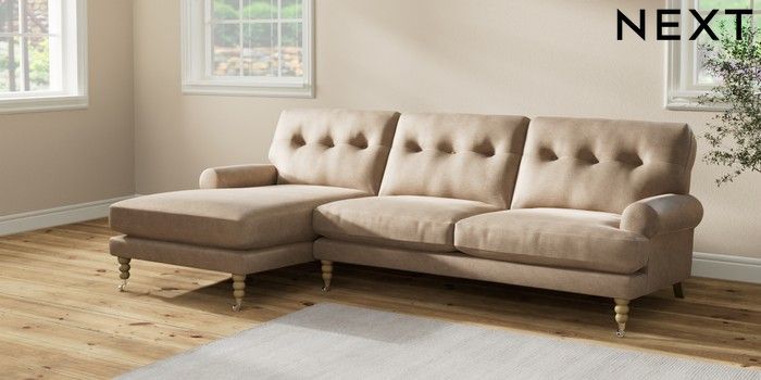7.2.10 Erin Buttoned Back Deep Relaxed Sit Medium Sofa Chaise - Left Hand Luxe Chenille Mid Camel Beige High Classic Turned Chrome Castor - Light | Made Click here to use our website with more accessibility support, for example screen readers
