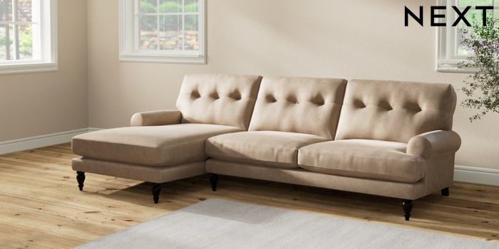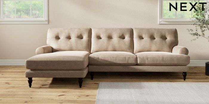 7.2.10 Erin Buttoned Back Deep Relaxed Sit Medium Sofa Chaise - Left Hand Luxe Chenille Mid Camel Beige High Classic Turned - Dark | Made Click here to use our website with more accessibility support, for example screen readers