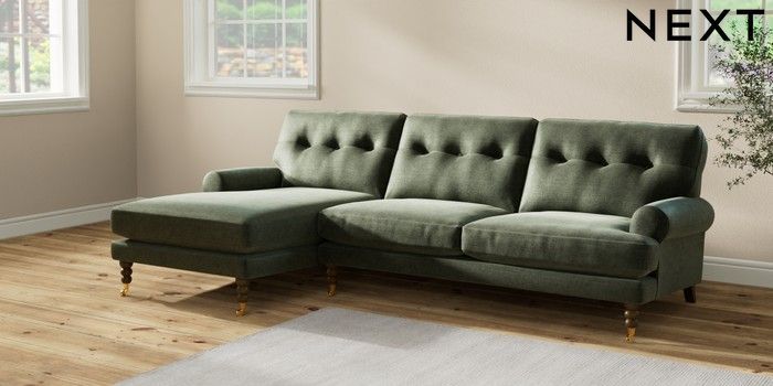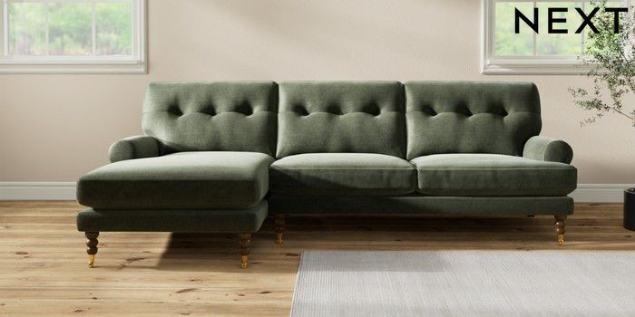 7.2.10 Erin Buttoned Back Deep Relaxed Sit Medium Sofa Chaise - Left Hand Luxe Chenille Mid Green High Classic Turned Brass Castor - Mid | Made Click here to use our website with more accessibility support, for example screen readers