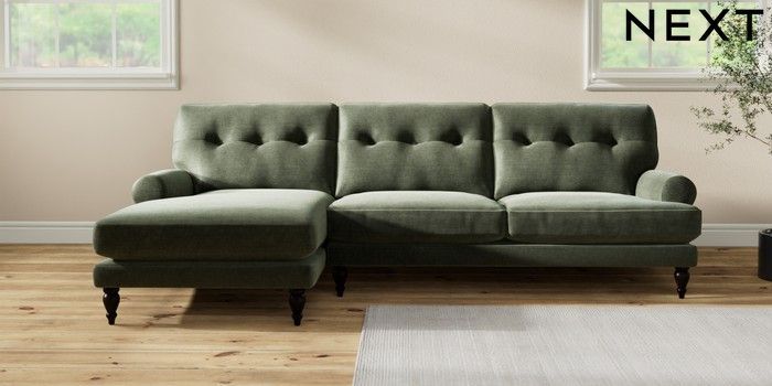 7.2.10 Erin Buttoned Back Deep Relaxed Sit Medium Sofa Chaise - Left Hand Luxe Chenille Mid Green High Classic Turned - Dark | Made Click here to use our website with more accessibility support, for example screen readers