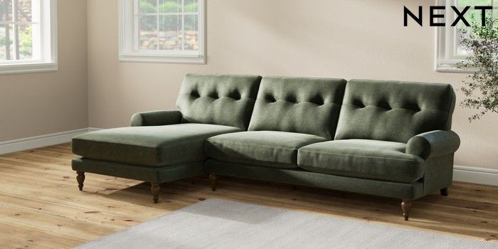7.2.10 Erin Buttoned Back Deep Relaxed Sit Medium Sofa Chaise - Left Hand Luxe Chenille Mid Green High Classic Turned - Mid | Made Click here to use our website with more accessibility support, for example screen readers