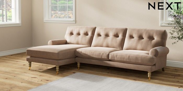 7.2.10 Erin Buttoned Back Deep Relaxed Sit Medium Sofa Chaise - Left Hand Luxe Chenille Mid Natural High Classic Turned Brass Castor - Light | Made Click here to use our website with more accessibility support, for example screen readers