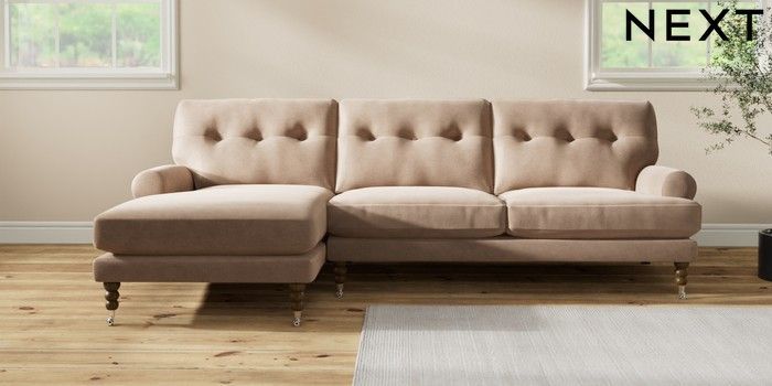 7.2.10 Erin Buttoned Back Deep Relaxed Sit Medium Sofa Chaise - Left Hand Luxe Chenille Mid Natural High Classic Turned Chrome Castor - Mid | Made Click here to use our website with more accessibility support, for example screen readers