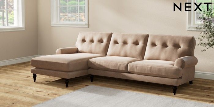 7.2.10 Erin Buttoned Back Deep Relaxed Sit Medium Sofa Chaise - Left Hand Luxe Chenille Mid Natural High Classic Turned - Dark | Made Click here to use our website with more accessibility support, for example screen readers