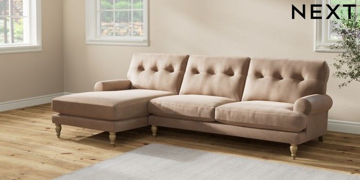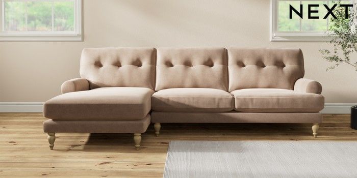 7.2.10 Erin Buttoned Back Deep Relaxed Sit Medium Sofa Chaise - Left Hand Luxe Chenille Mid Natural High Classic Turned - Light | Made Click here to use our website with more accessibility support, for example screen readers