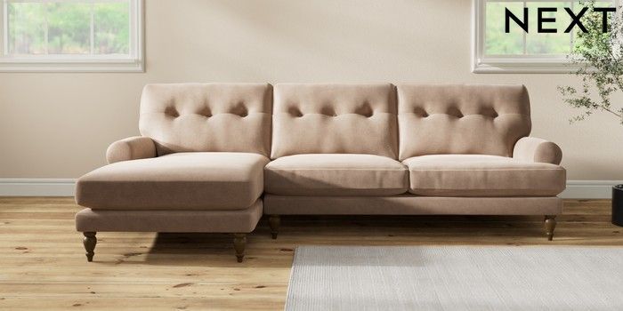 7.2.10 Erin Buttoned Back Deep Relaxed Sit Medium Sofa Chaise - Left Hand Luxe Chenille Mid Natural High Classic Turned - Mid | Made Click here to use our website with more accessibility support, for example screen readers