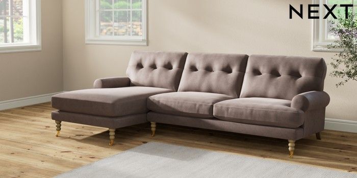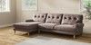 7.2.10 Erin Buttoned Back Deep Relaxed Sit Medium Sofa Chaise - Left Hand Luxe Chenille Mink Brown High Classic Turned Brass Castor - Light | Made Click here to use our website with more accessibility support, for example screen readers