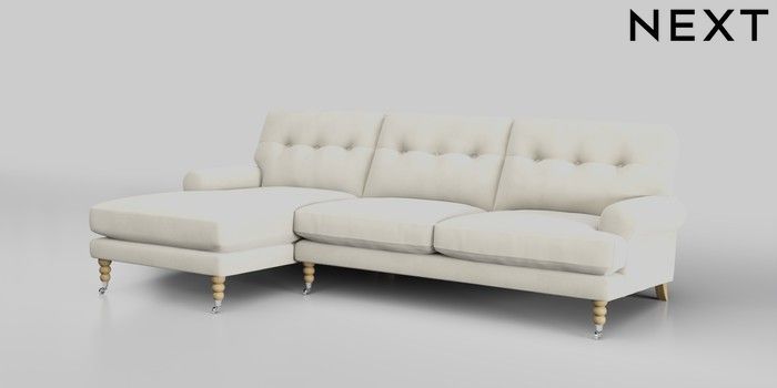 7.2.10 Erin Buttoned Back Deep Relaxed Sit Medium Sofa Chaise - Left Hand Luxe Chenille Oyster High Classic Turned Chrome Castor - Light | Made Click here to use our website with more accessibility support, for example screen readers