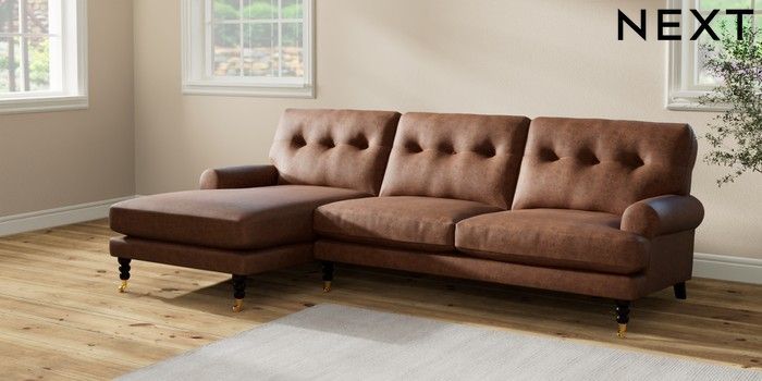 7.2.10 Erin Buttoned Back Deep Relaxed Sit Medium Sofa Chaise - Left Hand Monza Faux Leather Easy Clean Chestnut Brown High Classic Turned Brass Castor - Dark | Made Click here to use our website with more accessibility support, for example screen readers