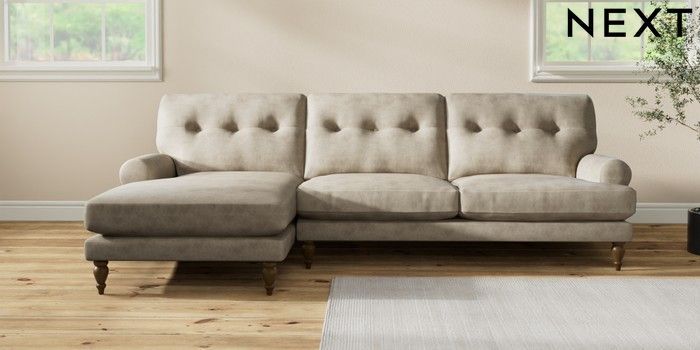 7.2.10 Erin Buttoned Back Deep Relaxed Sit Medium Sofa Chaise - Left Hand Monza Faux Leather Easy Clean Mink Brown High Classic Turned - Mid | Made Click here to use our website with more accessibility support, for example screen readers