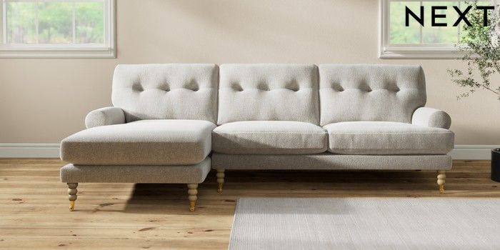7.2.10 Erin Buttoned Back Deep Relaxed Sit Medium Sofa Chaise - Left Hand Multi Weave Light Blue High Classic Turned Brass Castor - Light | Made Click here to use our website with more accessibility support, for example screen readers
