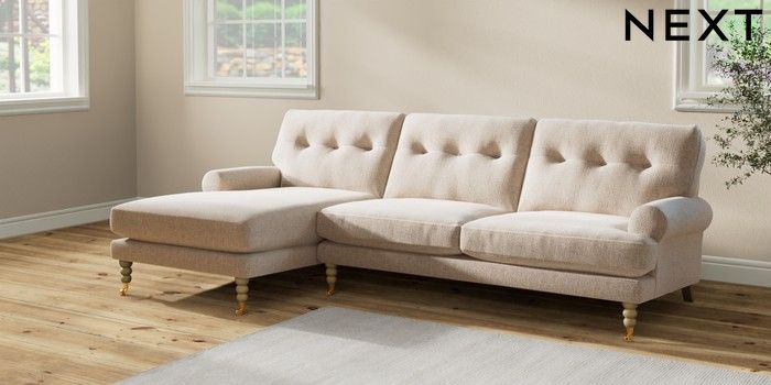 7.2.10 Erin Buttoned Back Deep Relaxed Sit Medium Sofa Chaise - Left Hand Multi Weave Mid Natural High Classic Turned Brass Castor - Light | Made Click here to use our website with more accessibility support, for example screen readers