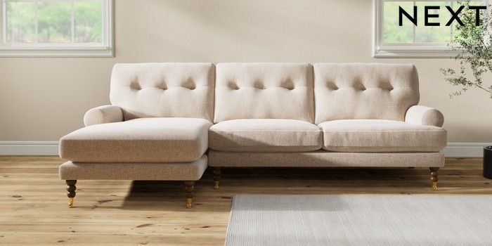 7.2.10 Erin Buttoned Back Deep Relaxed Sit Medium Sofa Chaise - Left Hand Multi Weave Mid Natural High Classic Turned Brass Castor - Mid | Made Click here to use our website with more accessibility support, for example screen readers