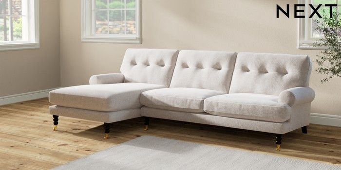 7.2.10 Erin Buttoned Back Deep Relaxed Sit Medium Sofa Chaise - Left Hand Multi Weave Oyster High Classic Turned Brass Castor - Dark | Made Click here to use our website with more accessibility support, for example screen readers