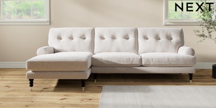 7.2.10 Erin Buttoned Back Deep Relaxed Sit Medium Sofa Chaise - Left Hand Multi Weave Oyster High Classic Turned Chrome Castor - Dark | Made Click here to use our website with more accessibility support, for example screen readers