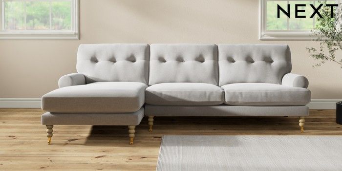 7.2.10 Erin Buttoned Back Deep Relaxed Sit Medium Sofa Chaise - Left Hand Natural Mix Light Grey High Classic Turned Brass Castor - Light | Made Click here to use our website with more accessibility support, for example screen readers
