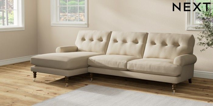 7.2.10 Erin Buttoned Back Deep Relaxed Sit Medium Sofa Chaise - Left Hand Natural Mix Light Natural High Classic Turned Chrome Castor - Mid | Made Click here to use our website with more accessibility support, for example screen readers