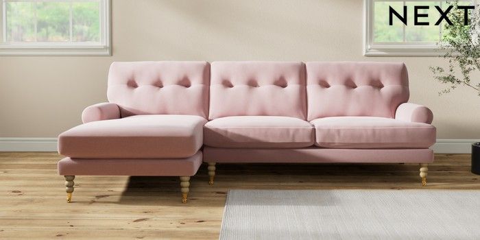 7.2.10 Erin Buttoned Back Deep Relaxed Sit Medium Sofa Chaise - Left Hand Natural Mix Light Rose Pink High Classic Turned Brass Castor - Light | Made Click here to use our website with more accessibility support, for example screen readers