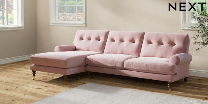 7.2.10 Erin Buttoned Back Deep Relaxed Sit Medium Sofa Chaise - Left Hand Natural Mix Light Rose Pink High Classic Turned Brass Castor - Mid | Made Click here to use our website with more accessibility support, for example screen readers
