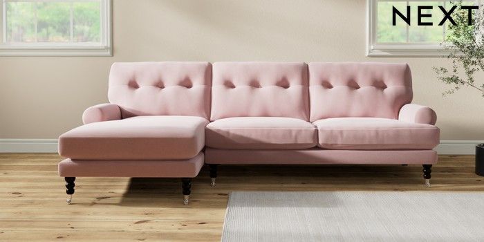 7.2.10 Erin Buttoned Back Deep Relaxed Sit Medium Sofa Chaise - Left Hand Natural Mix Light Rose Pink High Classic Turned Chrome Castor - Dark | Made Click here to use our website with more accessibility support, for example screen readers