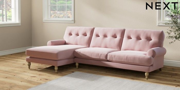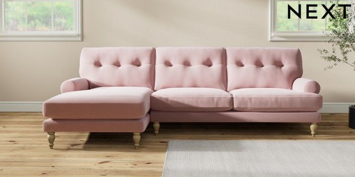 7.2.10 Erin Buttoned Back Deep Relaxed Sit Medium Sofa Chaise - Left Hand Natural Mix Light Rose Pink High Classic Turned - Light | Made Click here to use our website with more accessibility support, for example screen readers