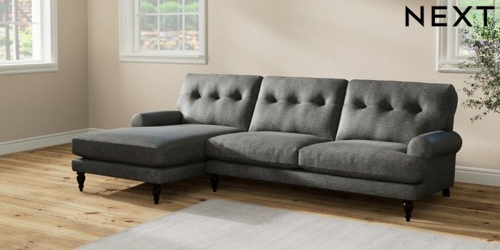 7.2.10 Erin Buttoned Back Deep Relaxed Sit Medium Sofa Chaise - Left Hand Plush Chenille Dark Grey High Classic Turned - Dark | Made Click here to use our website with more accessibility support, for example screen readers
